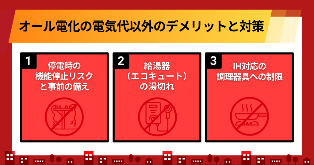 ガス併用住宅であれば、停電時でもガスコンロでお湯を沸かしたり調理したりできる場合がありますが、オール電化では不可能となります。