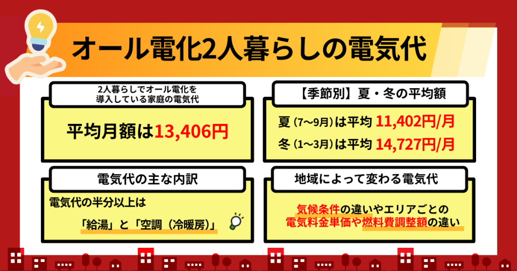 オール電化の2人暮らしを始めたものの、「とくに冬場の電気代が予想以上に高くて驚いた」「うちの電気代は平均より高いのでは」と不安を感じている方も多いでしょう。