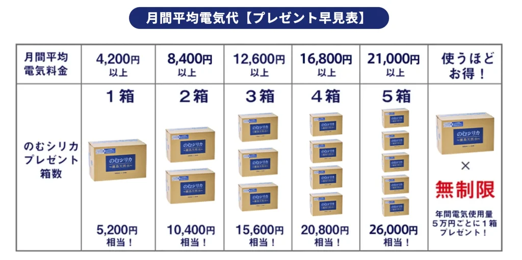 同サービスは、電気料金に応じて人気の天然水「のむシリカ」がもらえる非常にユニークな特典が魅力です。