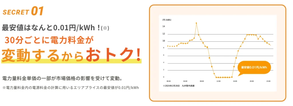 最安値で0.01円/kWhになる場合もあるため、安い時間帯を狙って洗濯機やエコキュートを稼働させれば、大幅な電気代の節約が可能です。