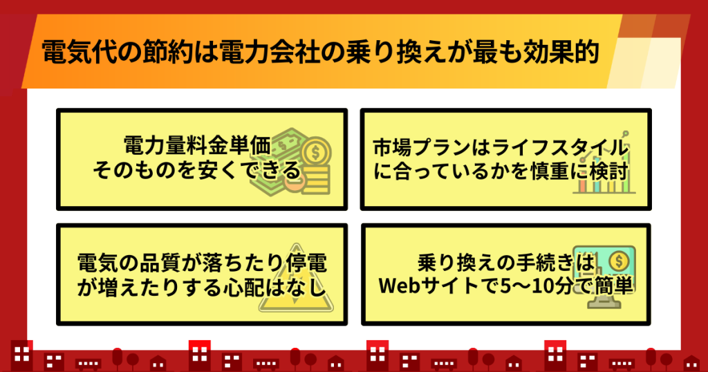 - 我慢せず安くするなら「電力会社の乗り換え」が最も効果的