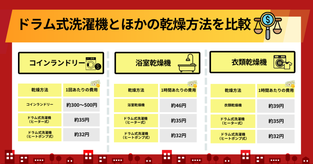 つまり、タイマーなどを駆使して、電気代が底値になる昼間の時間帯にドラム式洗濯機の乾燥機能を回せば、電気代を劇的に抑えられます。