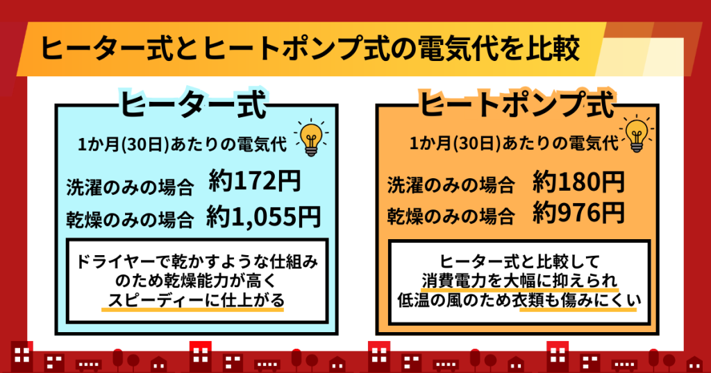 ヒートポンプ式の方が電気代は安い傾向にありますが、フィルター掃除やまとめ洗い、省エネコースの活用など、日々の工夫でさらに節約が可能です。