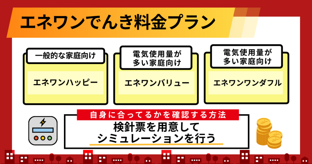 代表的なプランは、一般的な家庭向けの「エネワンハッピー」、電力使用量が多い家庭向けの「エネワンバリュー」「エネワンワンダフル」の3つです。