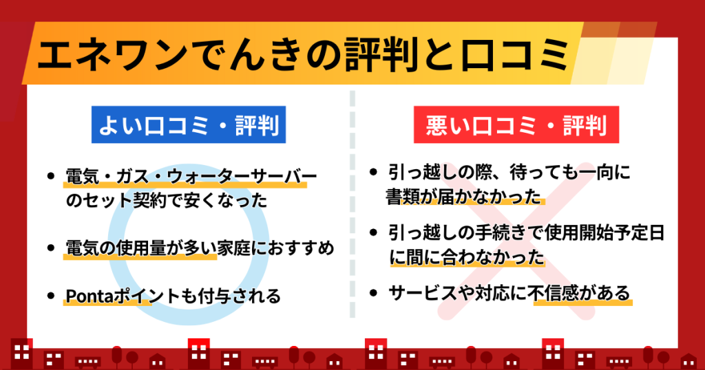 ここでは、インターネット上やSNSで見られるエネワンでんきの「よい口コミ」と「悪い口コミ」を紹介します。