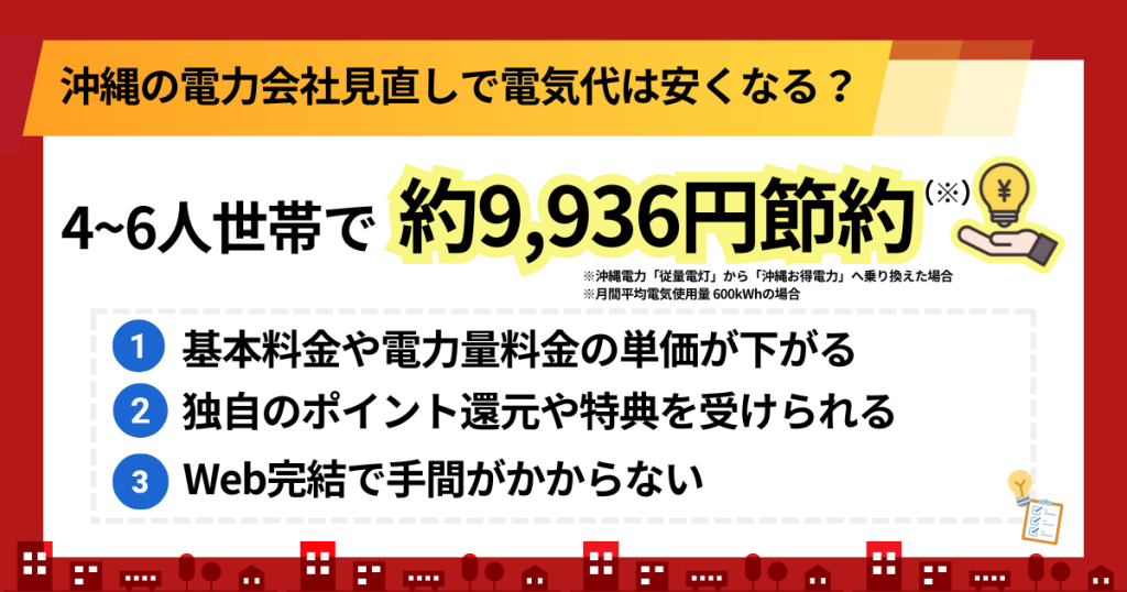 沖縄電力から新電力会社へ見直すことで、多くの家庭で電気代を節約できる可能性があります。