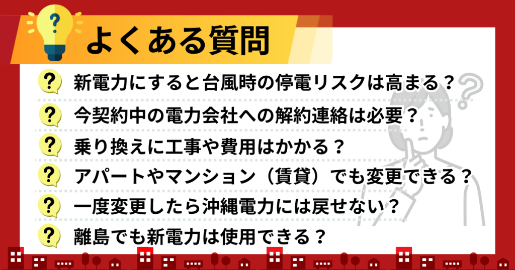 ここでは、沖縄での電力会社乗り換えに関して、とくによく寄せられる質問とその回答をまとめました。