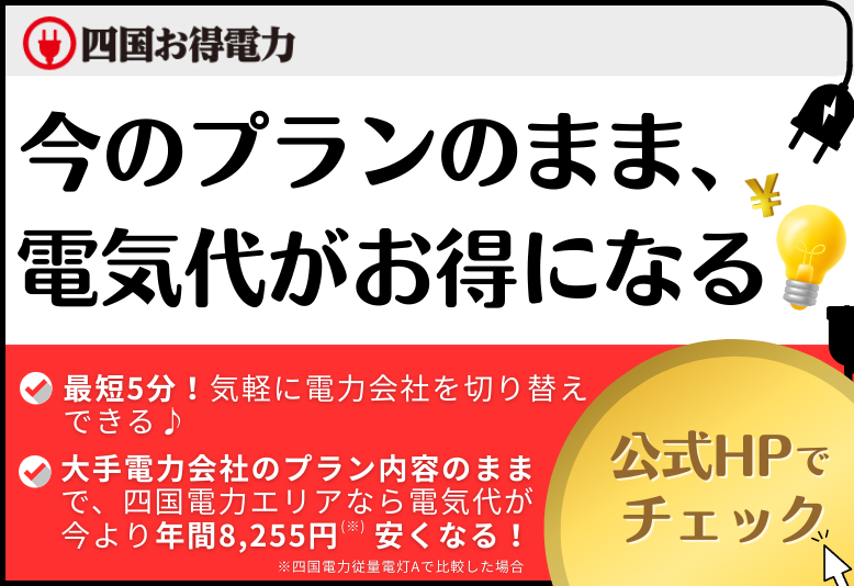 数ある選択肢のなかでも、とくに四国電力を利用中の方におすすめしたい電力会社は、四国お得電力です。