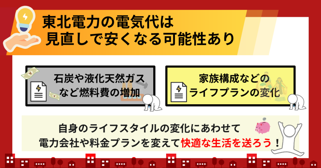 ここでは、東北電力で電気代が上がったと感じる原因や、安くなる可能性について解説します。